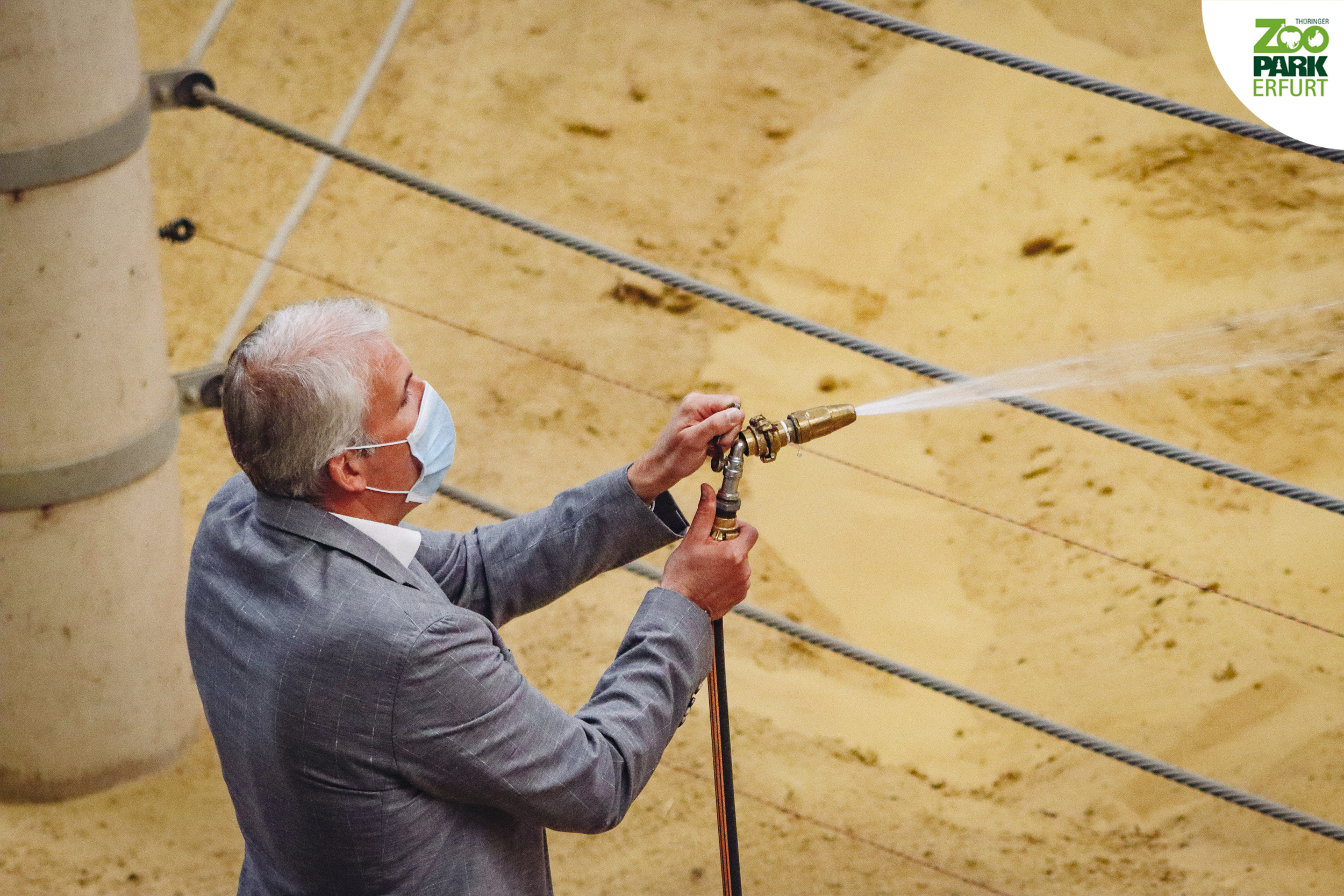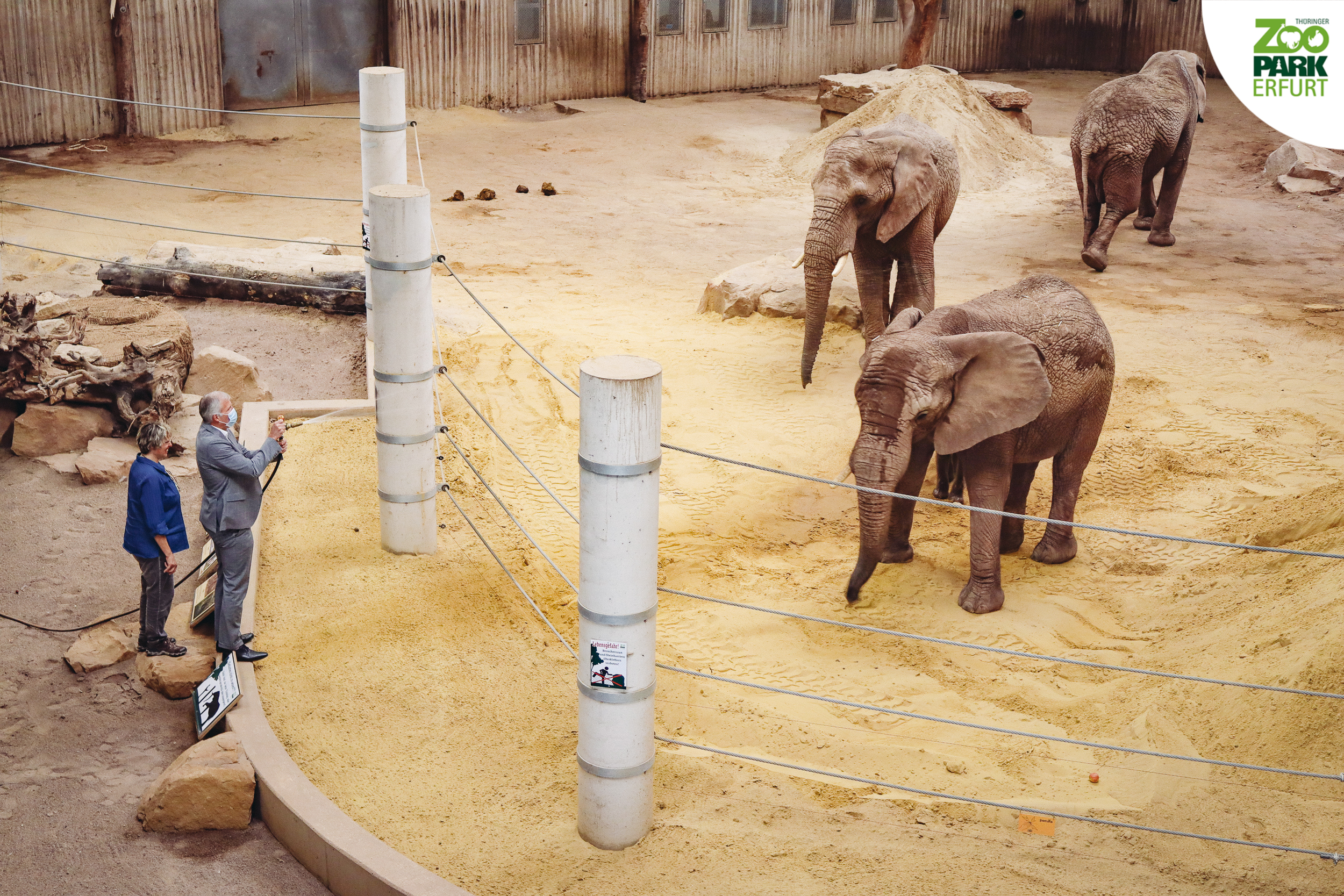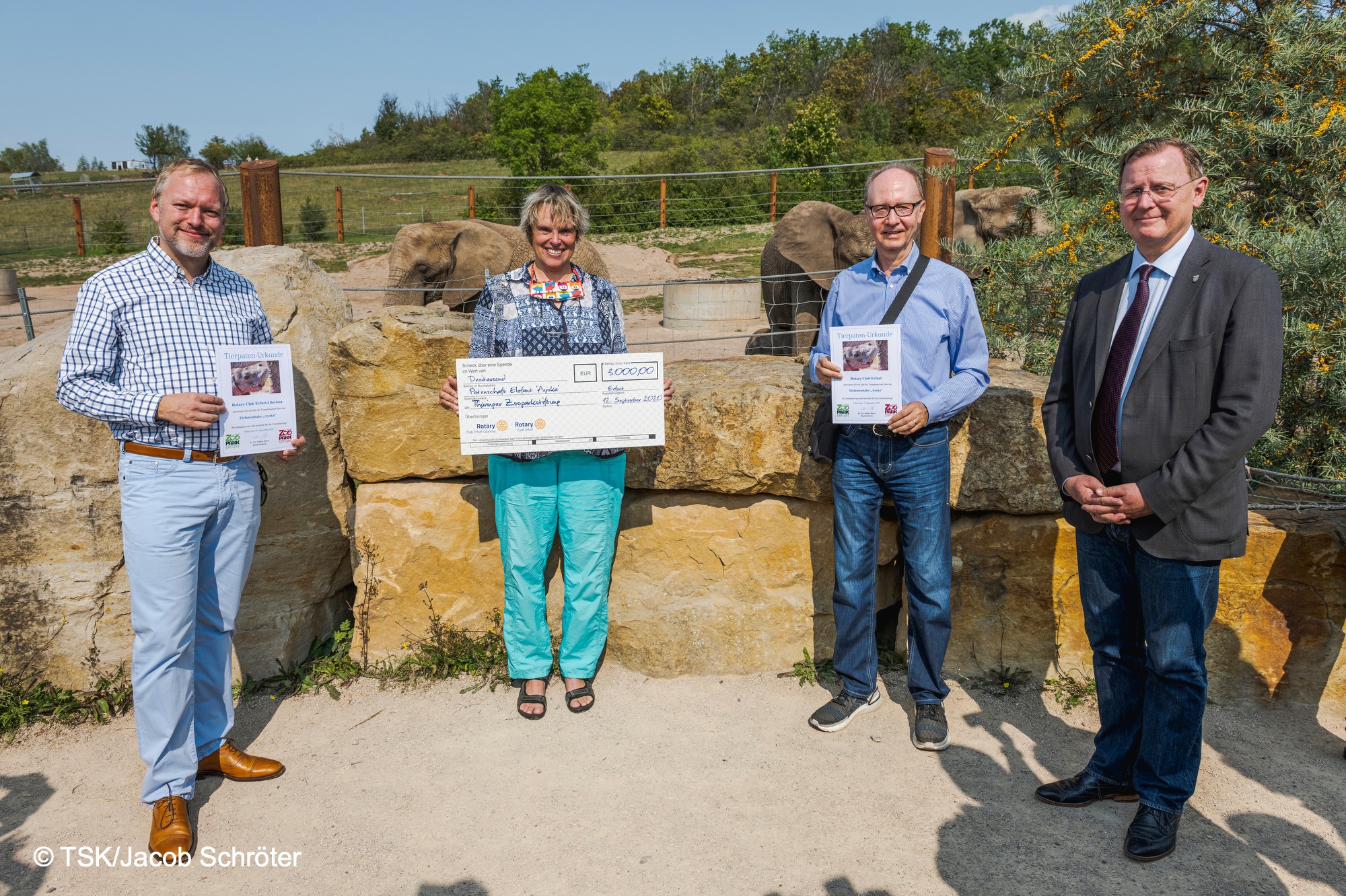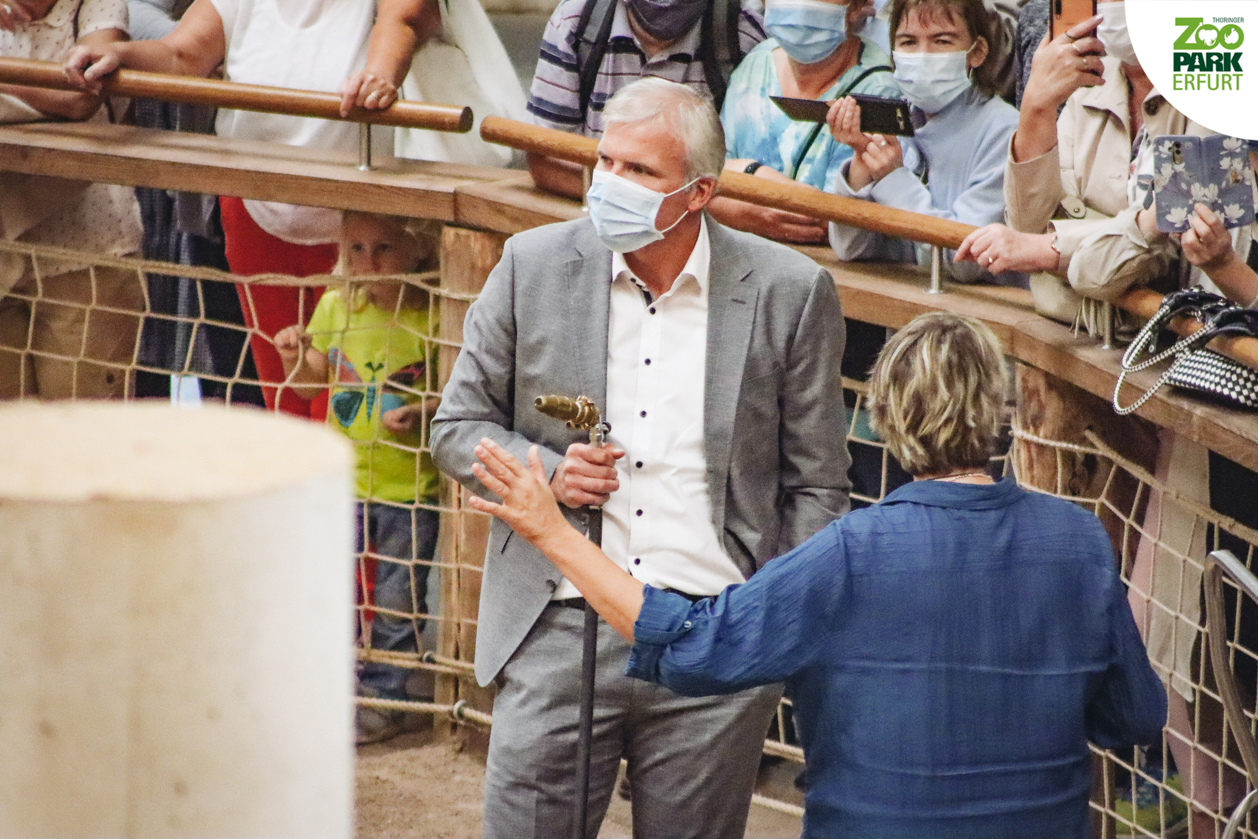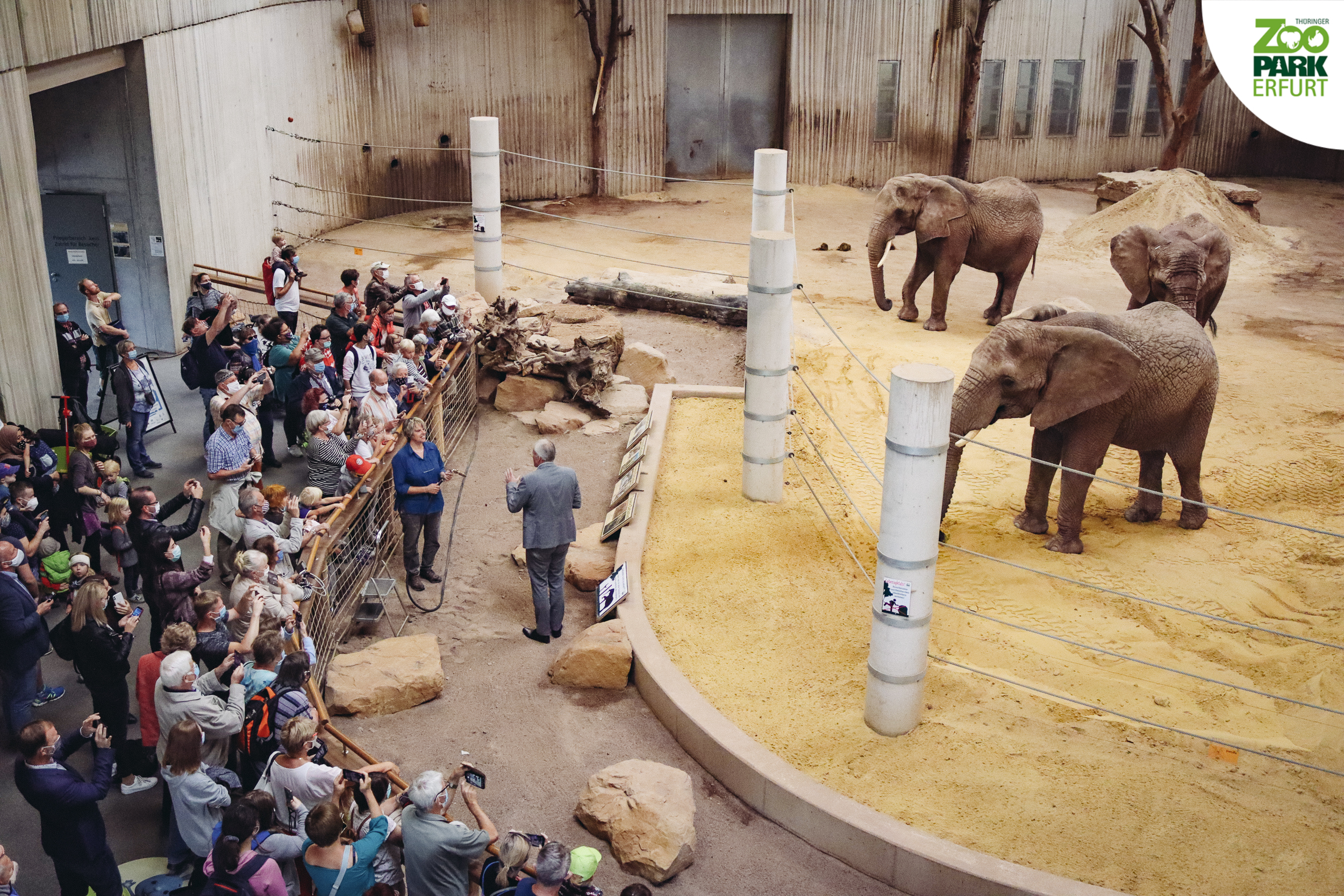 "Den rotarischen Freunden darf ich für die Patenschaft danken. Ich wünsche dem Zoopark alles Gute und sage ein großes Dankeschön an die Pflegerinnen und Pfleger, die sich so wunderbar kümmern.“, so Ministerpräsident Bodo Ramelow in seinem Grußwort. Anschließend besichtigte er in einem Rundgang gemeinsam mit Zoodirektorin Dr. Dr. Sabine Merz das Nashornhaus und die Elefantenausstellung.