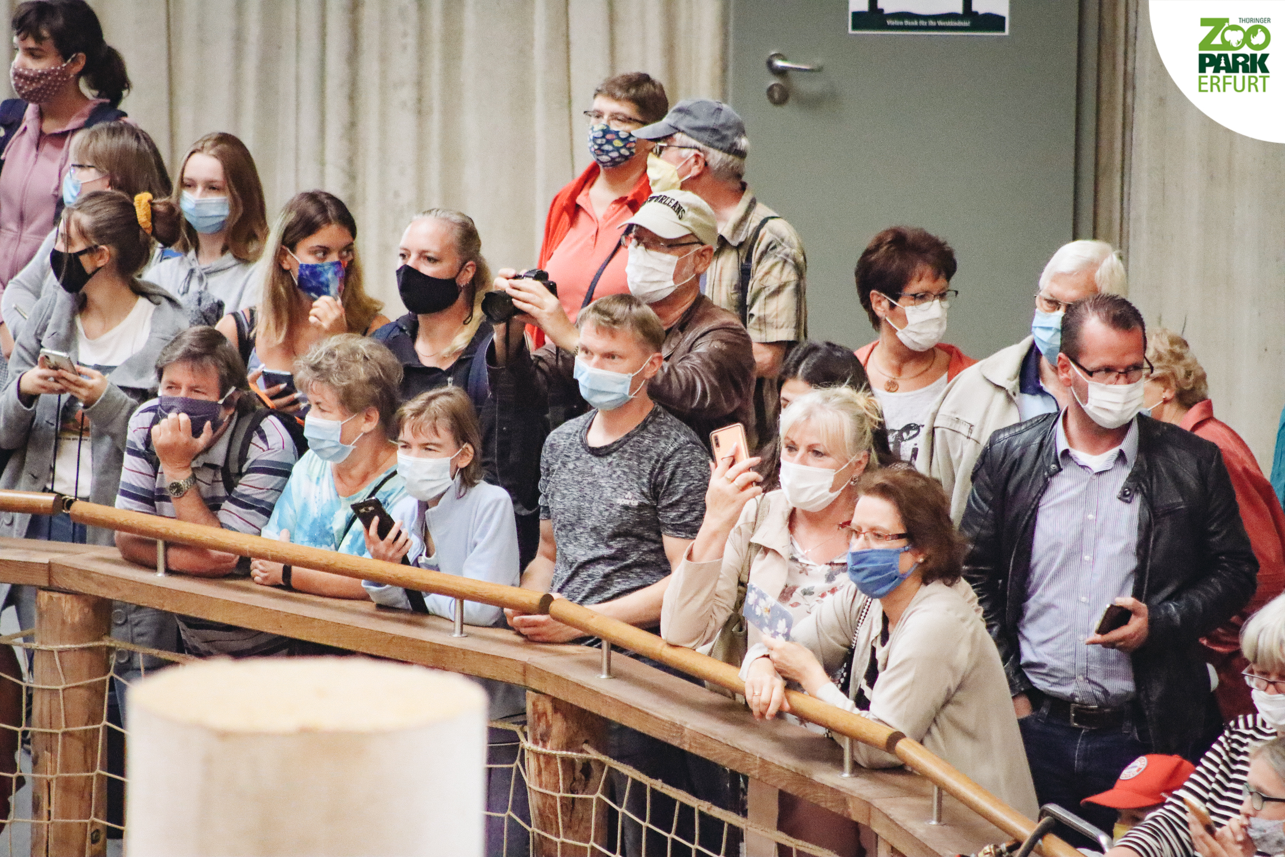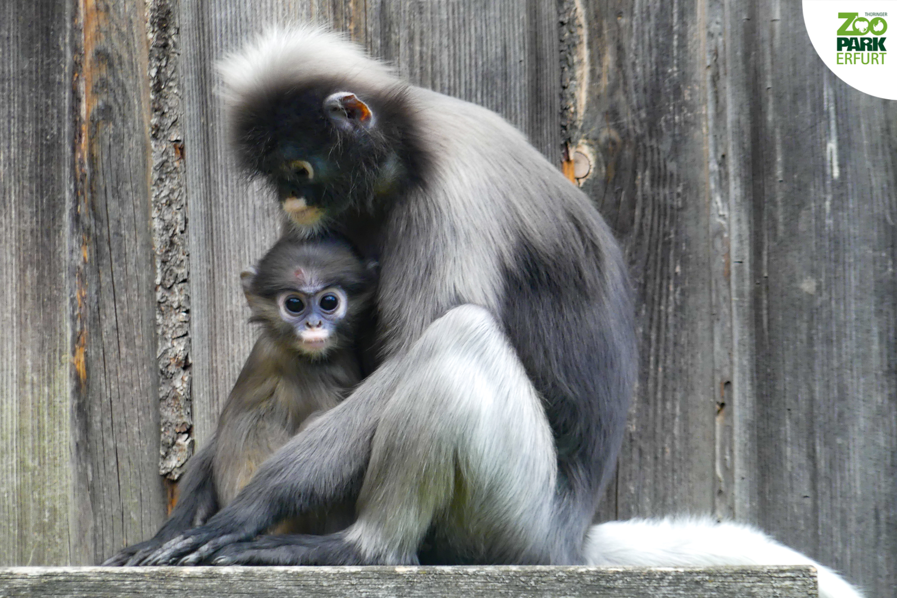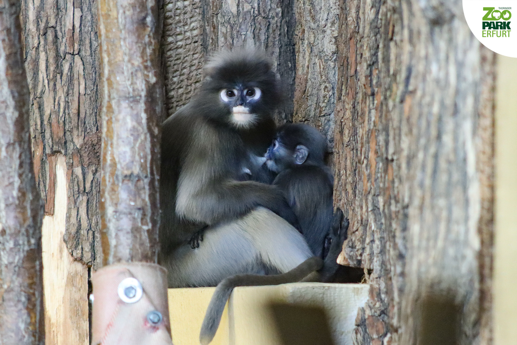 Weiter geht’s bei den Brillenlanguren. Hier passt „Ursa“ auf ihr Jungtier „Henry“ auf. Bei der Geburt sind die kleinen Brillenlanguren noch leuchtend orange gefärbt. Inzwischen trägt das Jungtier aber die Farbe der erwachsenen Tiere: ein unauffälliges Grau. Brillenlanguren sind sehr selten in Zoos zu sehen, in Deutschland nur im Thüringer Zoopark Erfurt.
