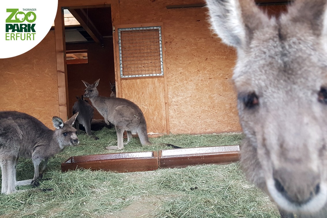 Die Gärtner waren fleißig und hatten in den letzten Wochen die Grünanlagen „frühlingstauglich“ gemacht. Gerade letzte Woche noch die vorgetriebenen Frühblüher in die Blumenkübel gepflanzt. So schön wie jedes Jahr. Dazu blühen die ersten Sträucher und Bäume: Blutpflaume (Prunus cerasifera) und Japanische Nelkenkirsche (Prunus serrulata). Die Kängurus beobachten eine Mitarbeiterin, die zum Fenster hereinschaut, Futter bringt und sich an der ersten Blütenpracht erfreut.
