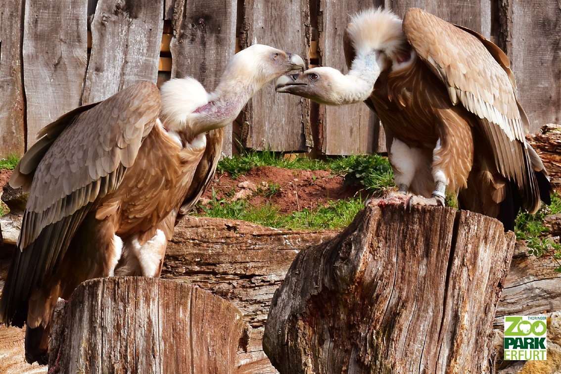 Gegenseitige Gefiederpflege ist angesagt. Wenn sich beide einig sind geht es an den Nestbau oder die Instandsetzung des alten Nestes. Dann folgen Eiablage und die Brut beginnt. Die Braut dauert zwischen 57 und 67 Tagen. Dann muss das Küken großgezogen, also immerfort gefüttert werden. Das braucht viel Zeit. Im Zoo gibt es aber immer Futter, was die Eltern dafür nutzen können. Das Küken wird mindestens 110 Tage lang gefüttert, aber auch 20 Tage mehr sind möglich. Es gibt also immer was zu tun für unsere Geier.