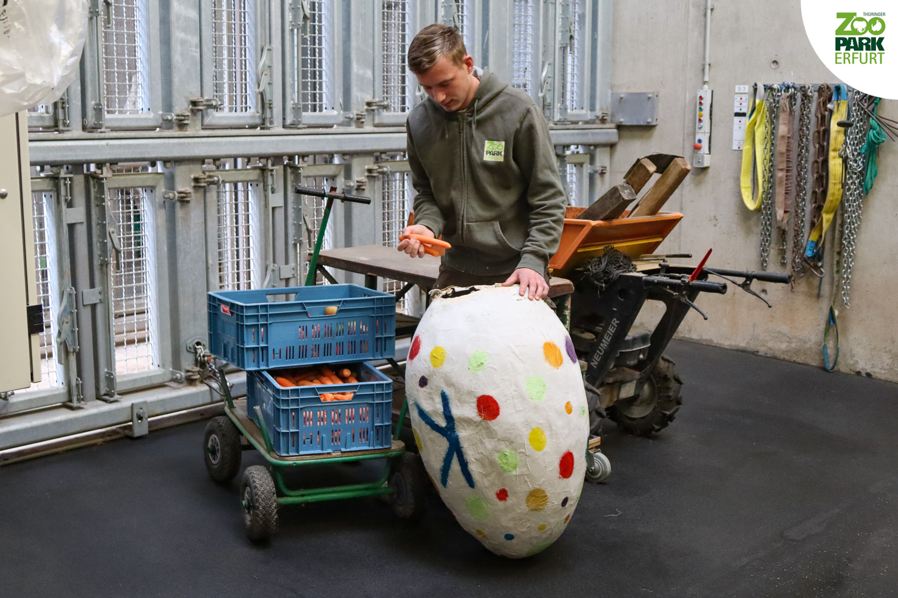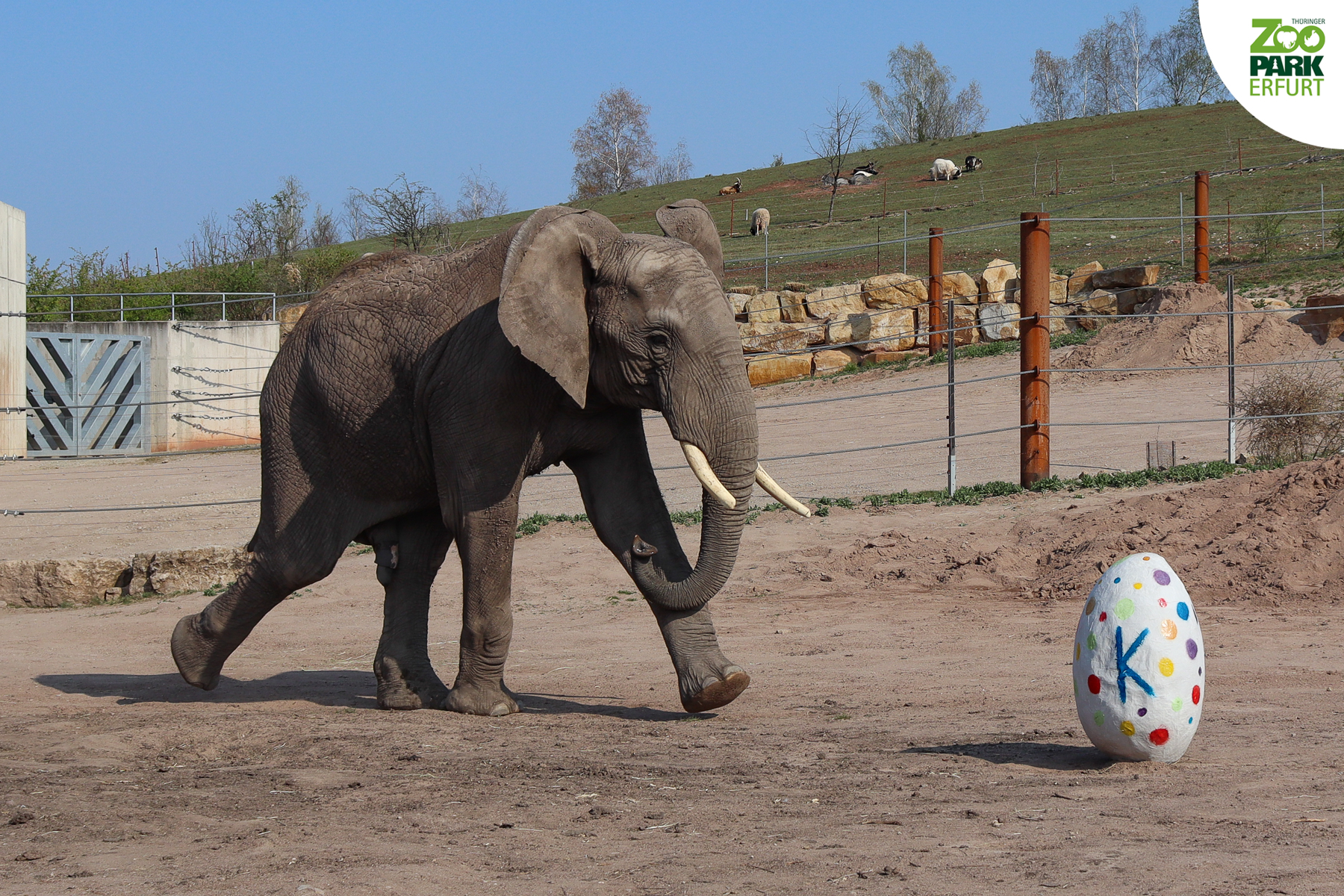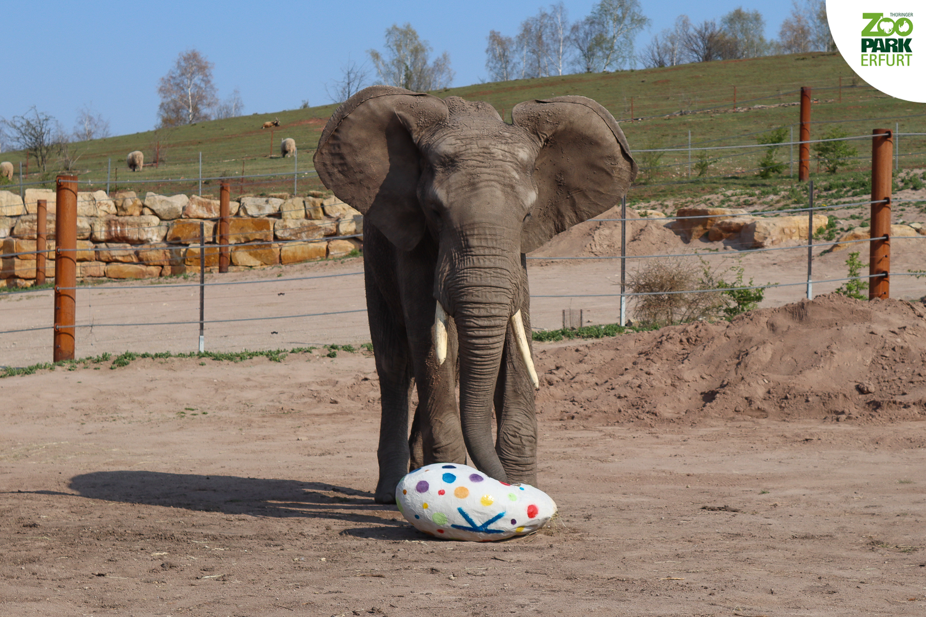 Aus Wasser, Mehl, Papier und viel Liebe zum Detail hat Titus den werdenden Elefanten-Papa ein riesiges Überraschungsei gebastelt. Gefüllt wurde das Ei mit allerhand Leckereien wie Äpfeln, Karotten und frischem Heu. Kibo hat es sichtlich geschmeckt! Das Team vom Thüringer Zoopark Erfurt wünscht Euch fröhliche Ostern und viel Gesundheit!