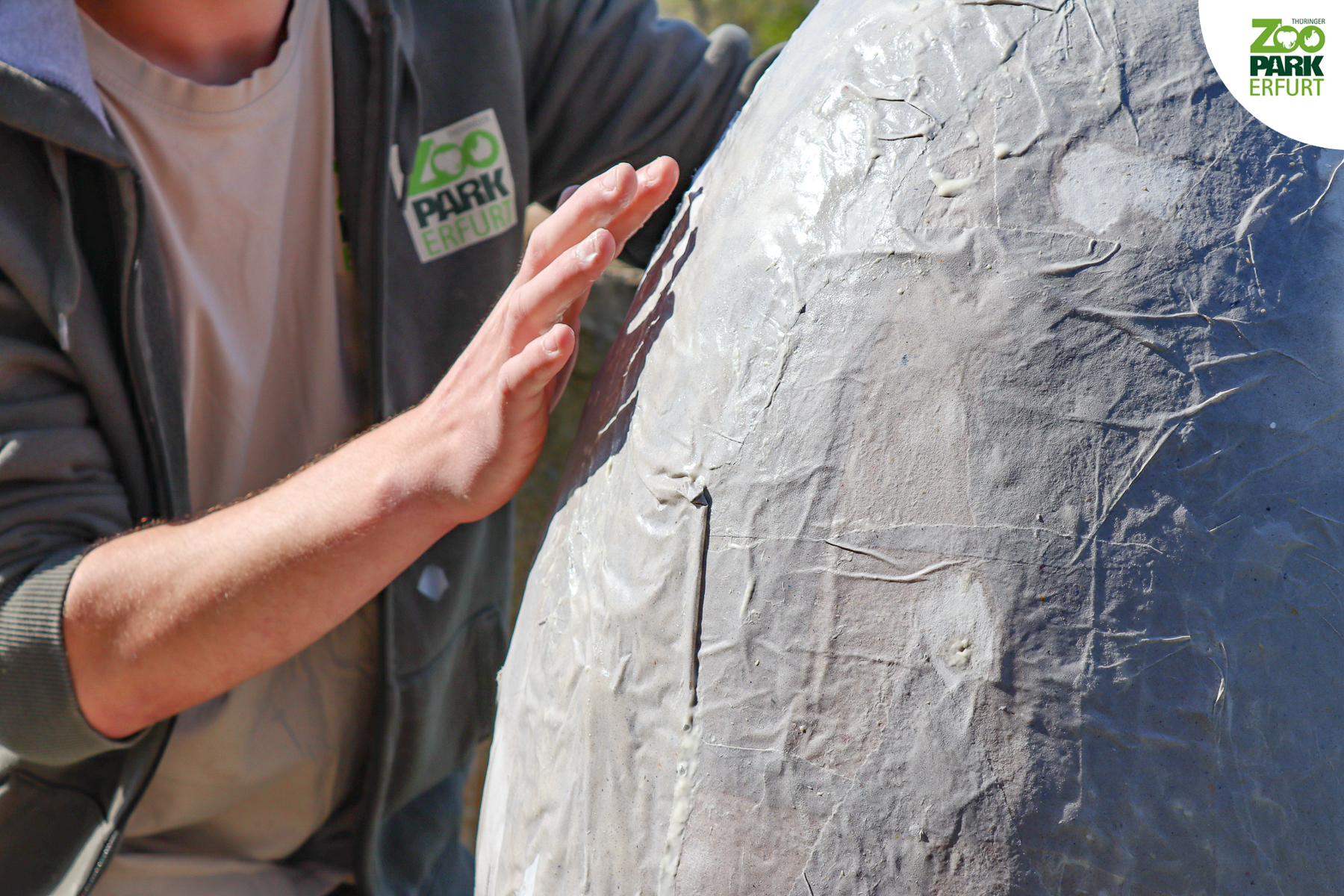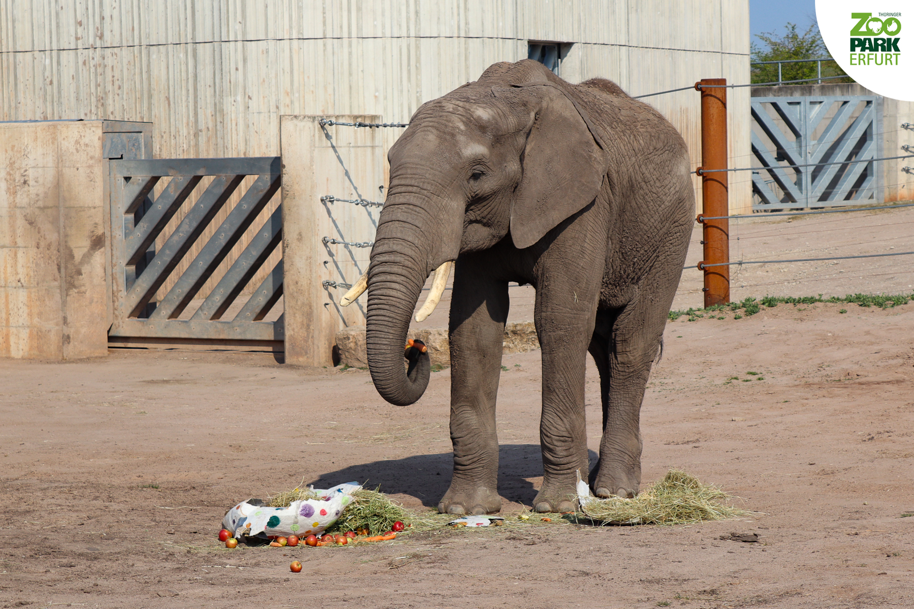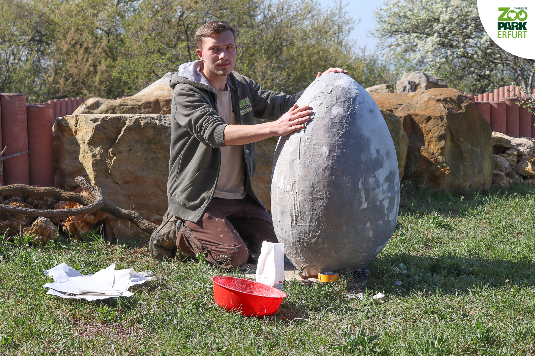 Aus Wasser, Mehl, Papier und viel Liebe zum Detail hat Titus den werdenden Elefanten-Papa ein riesiges Überraschungsei gebastelt. Gefüllt wurde das Ei mit allerhand Leckereien wie Äpfeln, Karotten und frischem Heu. Kibo hat es sichtlich geschmeckt! Das Team vom Thüringer Zoopark Erfurt wünscht Euch fröhliche Ostern und viel Gesundheit!